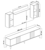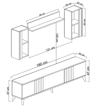 طاولة التلفاز: الارتفاع 47 سم، العرض 180 سم، العمق 30 سم | مقاس الرف: عرض 90 سم | مقاس العلبة: الارتفاع 60 سم، العرض 30 سم، العمق 20 سم